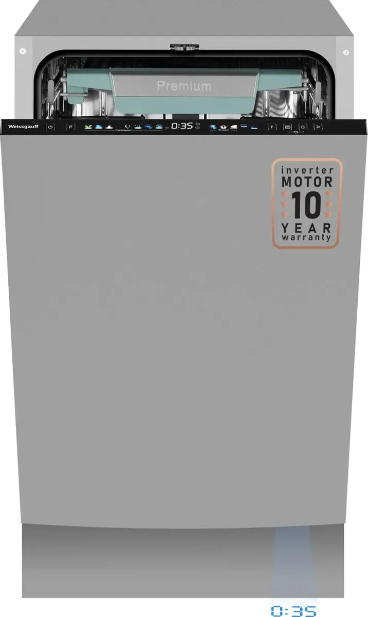 Узкая посудомоечная машина Weissgauff, оснащенная оснащенная проекцией времени до окончания цикла работы на полу, инверторным двигателем и функцией автоматического открытия дверцы, а также инновационный цветной дисплей SMART SCREEN, что делает данную модель не только эффективной, но и по-настоящему удобной в работе не только сэкономит место на вашей кухне, но и обеспечит идеальный результат: 3 корзины позволят расположить посуду оптимальным образом для достижения наилучшего качества мытья, а наличие 7 программ позволит подобрать оптимальный режим в зависимости от количества посуды и степени загрязнения.