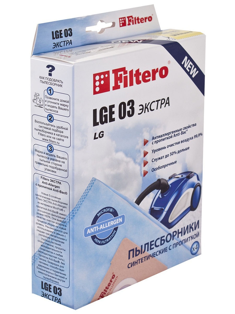 Пылесборники Filtero LGE 03 ЭКСТРА Anti-Allergen произведены из 5-слойного синтетического микроволокна MicroFib с антибактериальной пропиткой Anti-Bac, состоят из 3 слоев спанбонда и 2 слоев высококачественного мелтблауна - секрет превосходного уровня фильтрации мешков Filtero . Этим мешки Filtero отличаются от большинства мешков других производителей, применяющих меньше слоев и только один слой мелтблауна. Именно эти материалы используются для производства медицинских одноразовых масок. Пылесборники Filtero LGE 03 ЭКСТРА очень прочные, они не боятся острых предметов и влаги, собирают больше пыли (до 50%) и обеспечивают уровень очистки воздуха 99,9%, а также задерживают бактерии и препятствуют их распространению. Мощность всасывания пылесоса сохраняется в течение всего периода службы пылесборника.