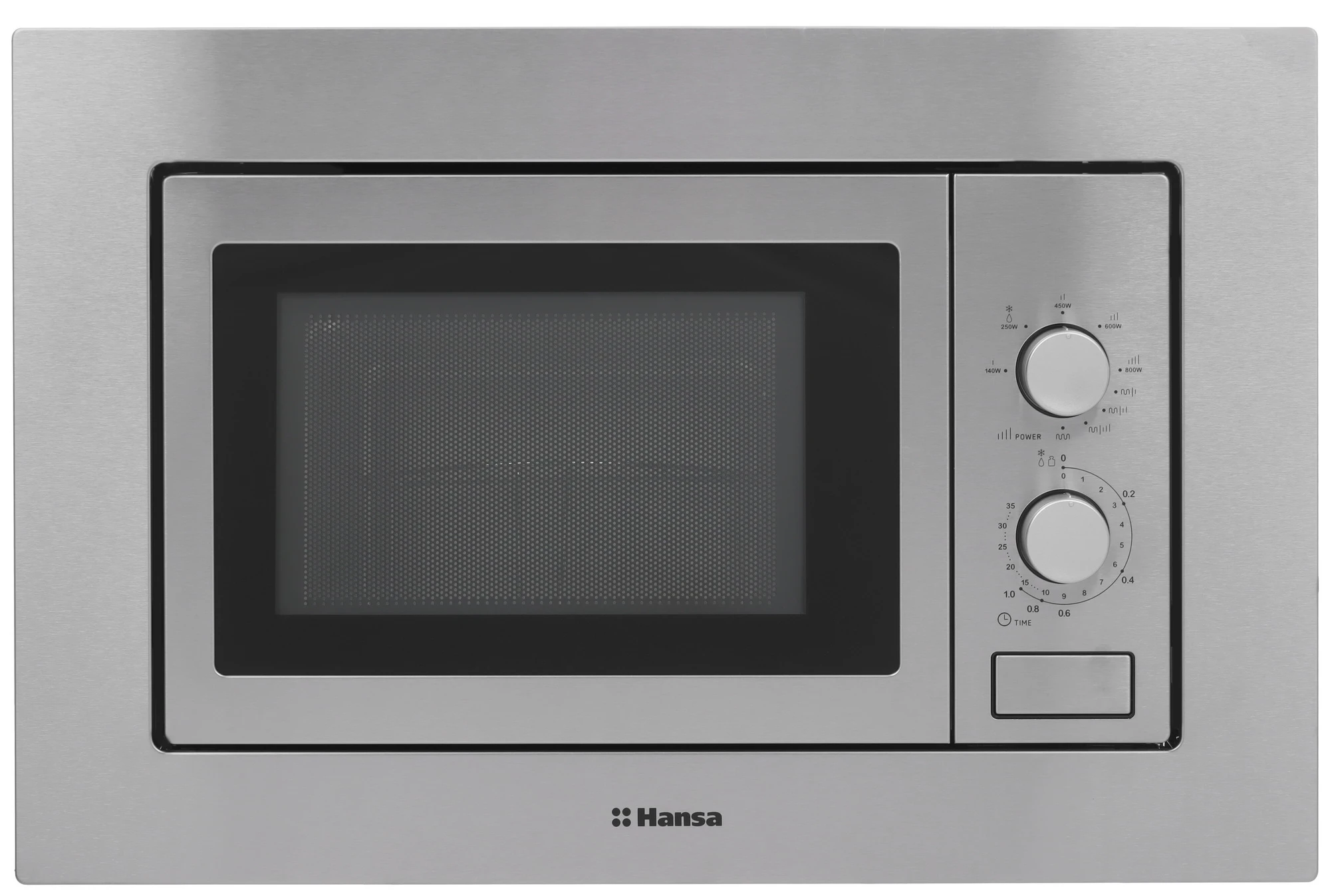 Встраиваемая микроволновая печь Hansa AMM20BMXH изготовлена полностью из нержавеющей стали. Основной цвет – серебристый с использованием черного цвета. Размеры печки ширина/высота 59.8/38.8 см, то есть ниша для встраивания должна быть в пределах этих размеров. Навесная дверца открывается налево с помощью кнопки на корпусе. Управление режимами происходит с помощью вращающейся ручки. У микроволновой печки 3 режима работы. Гриль, разморозка и СВЧ. То есть вы сможете приготовить быстро как сосиски на завтрак в микроволновке, так и испечь пиццу с хрустящей корочкой. AMM20BMXH имеет 5 мощностей СВЧ. С помощью максимальной мощности вы сможете вскипятить молоко, средняя подойдёт для выпечки или варки каши. Самые низкие мощности предназначены для размягчения масла или подогрева уже готового блюда. Внутри печки находится вращающий стол диаметром 24.5 см. Он вынимается при необходимости для мытья. Так как внутренняя поверхность из нержавеющей стали, ее можно мыть с любым моющим средством.