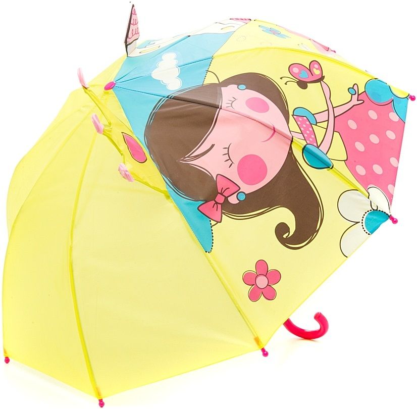 Производитель изделий для детей Mary Poppins представляет зонтик, который украшен изображением маленькой принцессы. При открытии зонта на голове у красавицы показывается большая желтая корона, а с другой стороны купола - ее замок. У принцессы на руке сидит бабочка, а вокруг нее множество цветов. У зонта металлическое основание, а ручка и наконечники для спиц сделаны из пластика.