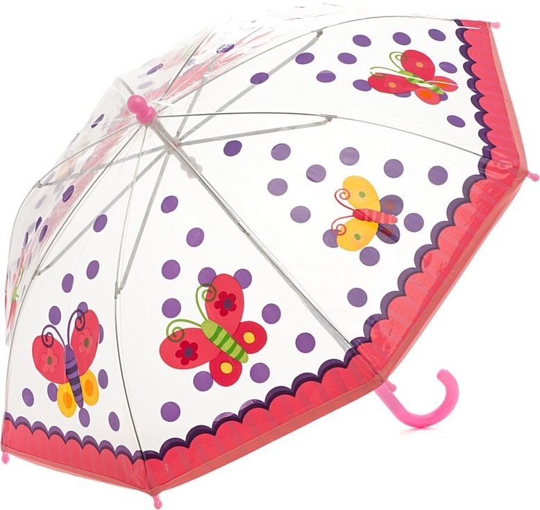 Детский прозрачный зонт "Бабочки" представляет собой замечательное средство защиты от проливного дождя и палящего солнца. Радиус купола - 41 см. Зонт украшен изображениями разноцветных бабочек, фиолетовыми точками и розовой окантовкой. У зонта - удобная загнутая ручка из пластика, прочный металлический каркас, а концы спиц надежно защищены пластмассовыми шариками. Зонтик-трость легко раскладывается и складывается благодаря специальному механизму.  С таким красочным зонтом девочке не будет страшна никакая непогода.