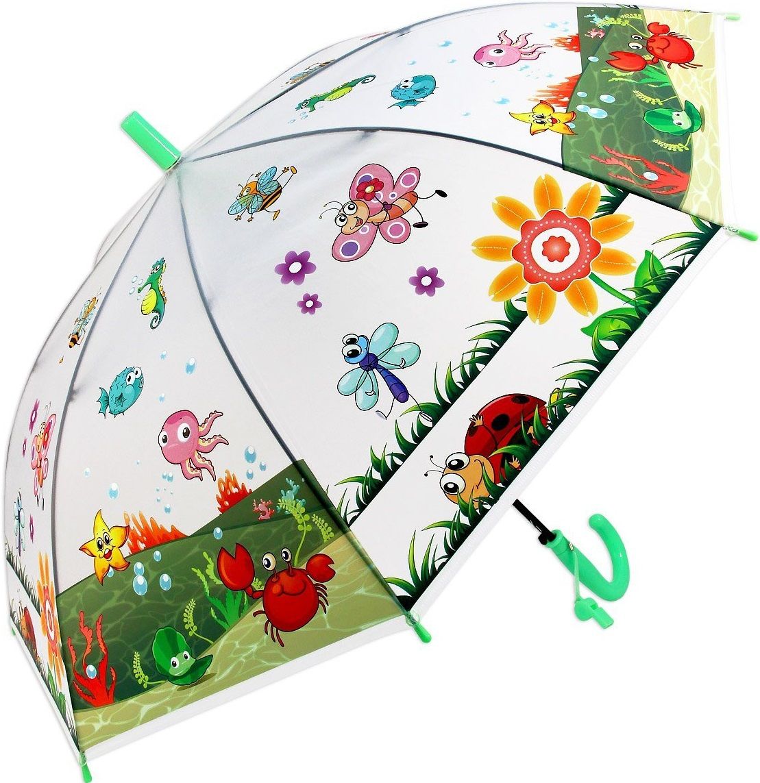 Для детей не бывает пасмурных дней, даже если за окном все серо и льет дождь. Когда на улице непогода, такой яркий зонт не только укроет от дождя, но и будет задавать веселое настроение своими красочными рисунками с изображением различных жителей морского дна и улыбающихся насекомых. Зонтик, благодаря своей красочности, точно будет выделяться и привлекать взгляд окружающих!