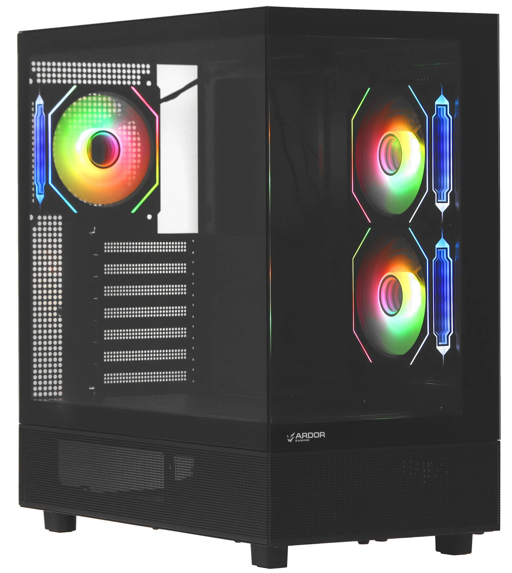 Задачу рассеивания тепла от нагревающихся компонентов ПК в корпусе-аквариуме ARDOR GAMING Crystal CC1 Black решают 3 оконных кулера размером 120 мм. В вентиляторы интегрирована подсветка на многоцветных ARGB-светодиодах. Для управления режимами работы подсветки предусмотрен специальный контроллер. В корпусе с обширными прозрачными панелями по кругу предусмотрен фильтр для защиты от попадания пыли.