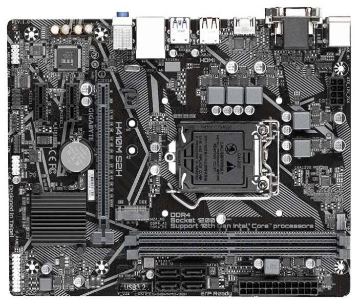 GigabyteСокет: LGA1200Поддерживаемые процессоры: Intel 10th Gen Core/Pentium Gold/CeleronЧипсет: Intel H410BIOS: AMIПамять: DDR4 DIMM, 2133-2933 МГцТип памяти: DDR4Количество слотов памяти: 2SATA: количество разъемов SATA 6Gb/s: 4 Количество слотов M.2: 1Тип интерфейса M.2: PCI-E/SATA 3.0Слоты расширения: 1xPCI-E x16, 2xPCI-E x1Звук: 7.1CH, HDA, на основе Realtek ALC887Наличие интерфейсов: 10 USB, 1xCOM, D-Sub, DVI, HDMI, Ethernet, PS/2 (клавиатура), PS/2 (мышь)Разъем подключения ленты RGB: естьФорм-фактор: microATXГарантия: 36 мес