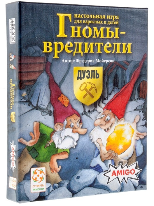 "Гномы - вредители: Дуэль" - Это интересная настольная игра. В этой версии легендарной игры вам предстоит сражение один на один. Гномы копают шахты, кладя на стол карточки туннелей, задача каждого – соединить вход в туннель своего цвета с карточками золотой жилы. Тогда объявляйте свое право на золото. Что бы замедлить соперника, нужно разыграть карту действия, портя его инструменты или обрушивая уже почти проложенную шахту. Соберите как можно больше золота и станьте победителем! В эту игру так же можно играть и одному.