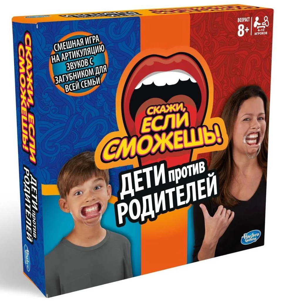 Приготовьтесь смеяться до слез с этой забавной игрой-состязанием на артикуляцию! Игра "Скажи, если сможешь! Дети против родителей" соберет семью вместе. Суть игры проста: игроки пытаются произнести фразы с загубниками, которые не позволяют им закрыть рот. Игрокам нужно прочитать фразы как можно лучше и четче, но это не так просто, ведь загубник не позволяет им корректно произносить слова. Таймер отсчитывает время, в то время, как одни игроки пытаются произнести фразы, а другие – расшифровать, что произнес член их команды и правильно отгадать фразу, чтобы заработать право отгадывать новую карточку. Команда, которая отгадает больше карточек, побеждает.