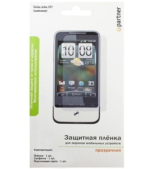Сенсорные дисплеи нуждаются в дополнительной защите, поскольку при эксплуатации неизбежно появляются микроцарапины, что ухудшает работу сенсора делая его менее чувствительным. Матовая защитная пленка Partner наклеивается на дисплей смартфона Nokia Asha 305 / Asha 306 и надежно защищает его от потертостей, царапин, пыли. Высококачественная, самоклеящаяся пленка легко наносится на экран, разглаживаясь без пузырей и складок. Изготавливается пленка из полимера на силиконовой основе, из сырья японского производства, что обеспечивает самую надёжную защиту дисплею. Вы сможете легко ее заменить самостоятельно, ведь она очень просто снимается с вашего гаджета, не оставляя никаких следов. Защитная пленка Partner для Nokia Asha 305 / Asha 306 идеально подходит для вашего телефона, ведь размер точно соответствует дисплею.