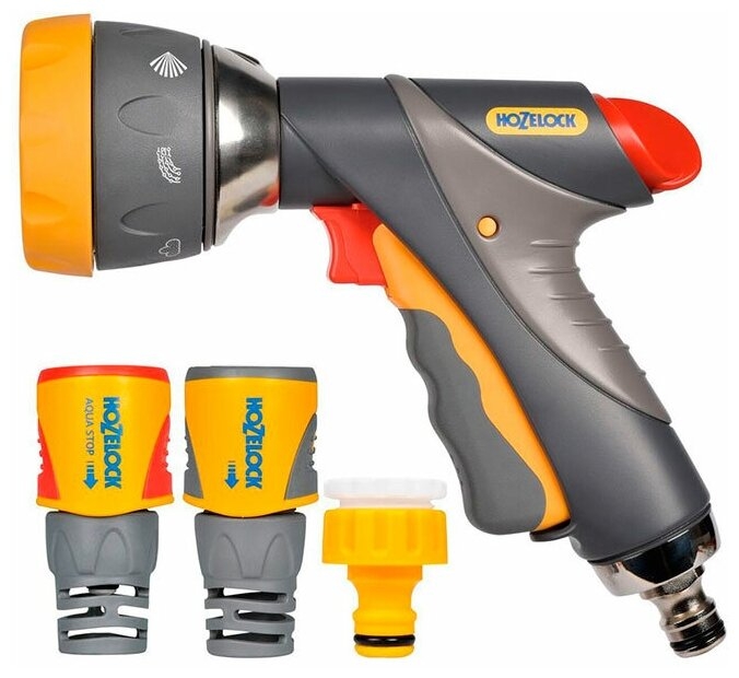 Комплектация: пистолет-распылитель мutli Spray Pro, коннектор для концов шлангов Plus (12,5 мм и 15 мм), коннектор aquastop Plus (12,5 мм и 15 мм), коннектор для крана вне помещений 1\2'' \ 3\4'' (12,5 мм и 19 мм)