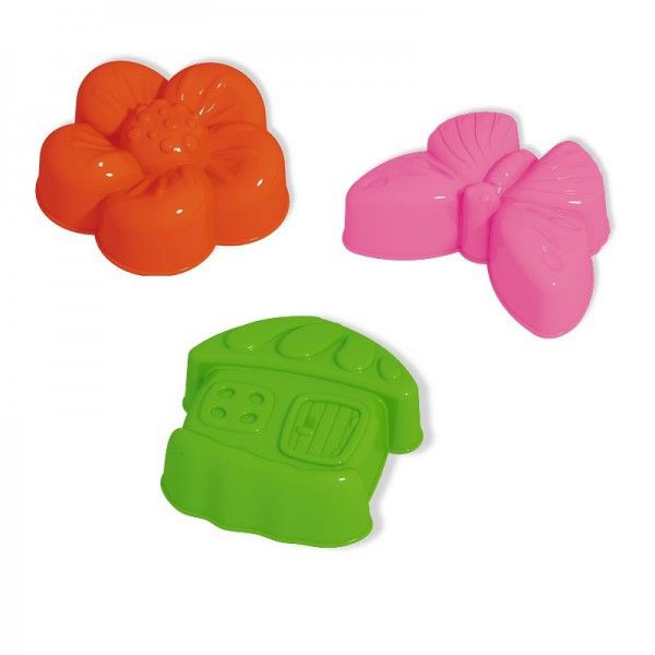 Набор формочек для игры в песочнице. Выполнен в виде цветочка, бабочки и домика. С помощью больших красочных формочек легко делать куличики даже самым маленьким. Игры в песочнице развивают мелкую моторику, малыши изучают цвета и формы. И учатся общаться друг с другом. Формочки изготовлены из яркой, качественной и прочной пластмассы.