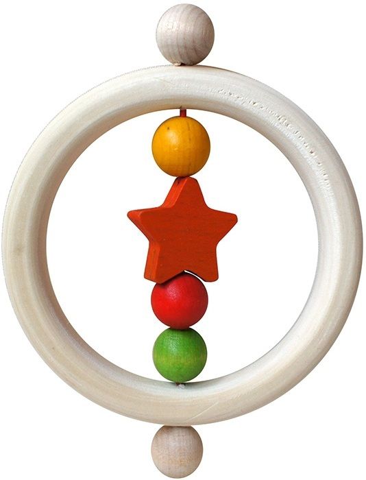 Погремушка "Звездочка" очень привлекательна для малыша. Внешнее кольцо выполнено из дерева без использования красящих веществ, так как именно данную часть дети как правило тянут в рот. Внутренние элементы – это 3 цветные бусины и симпатичная звёздочка, окрашены безопасными красками на водной основе.