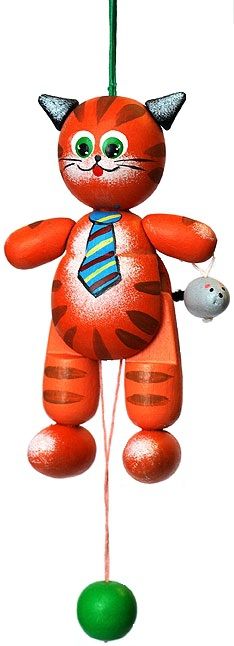 Тигровый, пузатый котейка-мышелов из семейства дергунчиков. Весело вскидывает лапки, стоит потянуть за шнурок с зеленым шариком. Забавная игрушка и яркое украшение детского уголка. Куклы-дергунчики издавна восхищали малышей, будили их творческую фантазию, заставляя задуматься о том, "как это работает". Котик от «Климо» и его мышка выточены на токарном станке из натурального дерева, доработаны и собраны вручную с применением надежного клея и нетоксичных красителей.