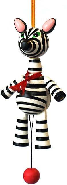 Кукла-дергунчик, полосатая лошадка в красном текстильном шарфе. Веревочные тяжи внутри корпуса позволяют Зебре двигать ножками, стоит потянуть за свисающий шнурок. Подобные игрушки с давних времен вызывают восхищение у детей и взрослых, служат забавными сувенирами и украшениями для новогодних елок, а также дают детям первое представление о механике. Зебра от "Климо" изготовлена из натурального дерева, собрана вручную и расписана стойкими, безопасными красками.