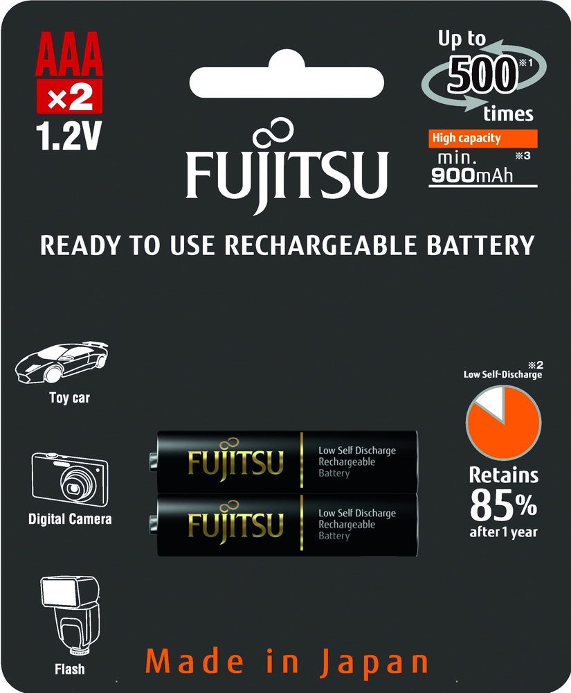 Аккумуляторы Fujitsu ААА, 900 mAh (HR-4UTHCEX(2B) - это идеальные источники питания для профессиональной фототехники, радиоуправляемых моделей игрушек, мощных фонарей и т.п. Цикл их перезарядки составляет 500 раз, но уровень саморазряда весьма низок - всего 15% за год.