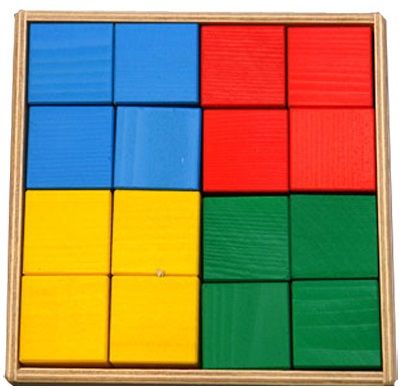 Деревянные кубики от производителя "Престиж" четырех разных цветов. Размер кубиков одинаковый.