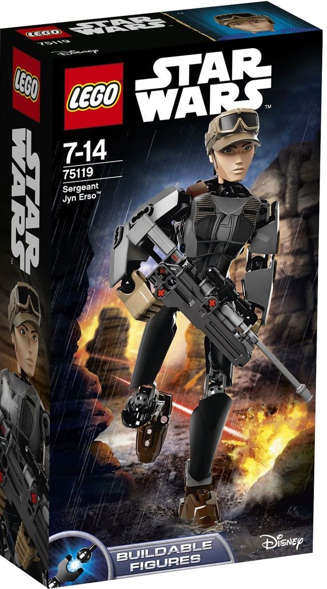 Для коллекционеров сборных моделей персонажей фильма "Звездные Войны", Star Wars от Lego предлагает набор деталей для сборки фигуры женщины-сержанта Джин Эрсо. Модель героини собирается из фигурных элементов разного цвета, которые соединяются за счет шарниров. Джин Эрсо сможет принимать любое положение во время игры, Вы сможете двигать ее ноги и руки, поворачивать голову, кроме того, у фигурки сгибаются коленные суставы и запястья. На корпусе готовой фигуры будет расположен небольшой механизм, за счет которого сержант сможет сделать взмах рукой. Костюм и лицо персонажа детально прорисованы.
