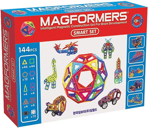 Магнитный конструктор крупный и яркий. Пластиковые детали конструктора от Magformers имеют магнитные вставки, за счет чего детали соединяются между собой. К деталям конструктора "Smart Set" прилагаются колеса для конструирования моделей машинок и мотоциклов.