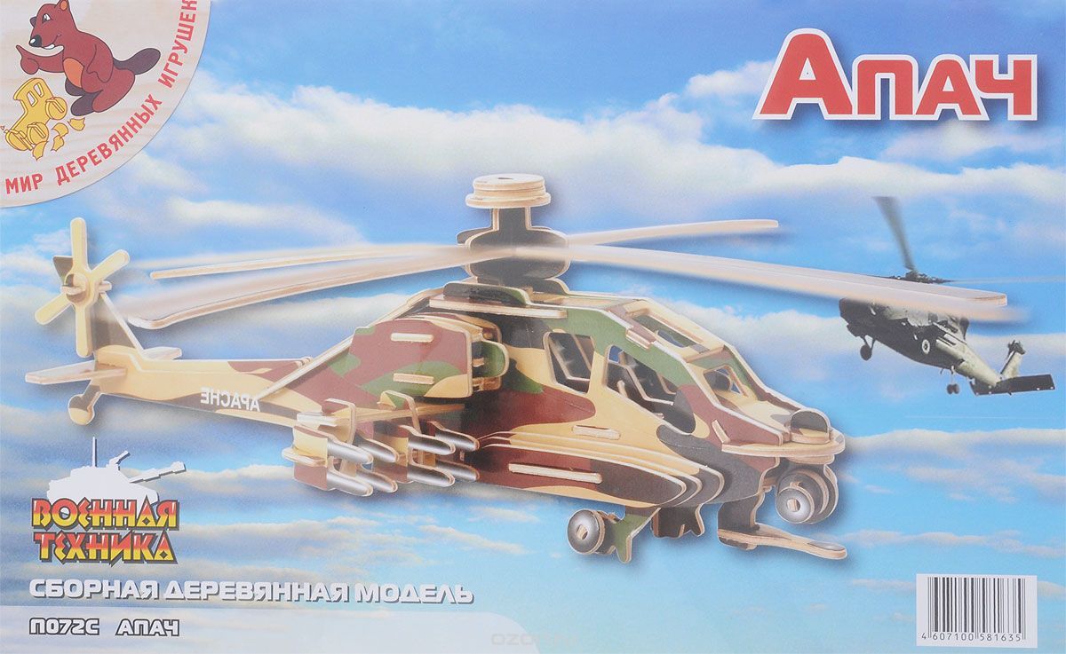 Обратите внимание на деревянную модель вертолета "Апач" от "Мира деревянных игрушек". Модель получается объемной. Частично окрашенные детали для сборки модели расположены в пластинах, из которых легко извлекаются. Клей Вам не потребуется.