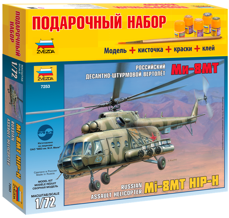 Обратите внимание на подарочный набор от "Звезды" для сборки модели вертолета "Ми-8МТ", в комплектацию которого входят краски, кисточка и клей для сборки.