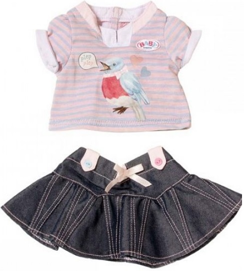 Всего в ассортименте от Zapf четыре комплекта одежды. Два из них предназначаются для куклы-девочки - это юбка с футболочкой. Другие два костюма подойдут для куклы-мальчика - шорты с футболкой или штаны с футболкой.