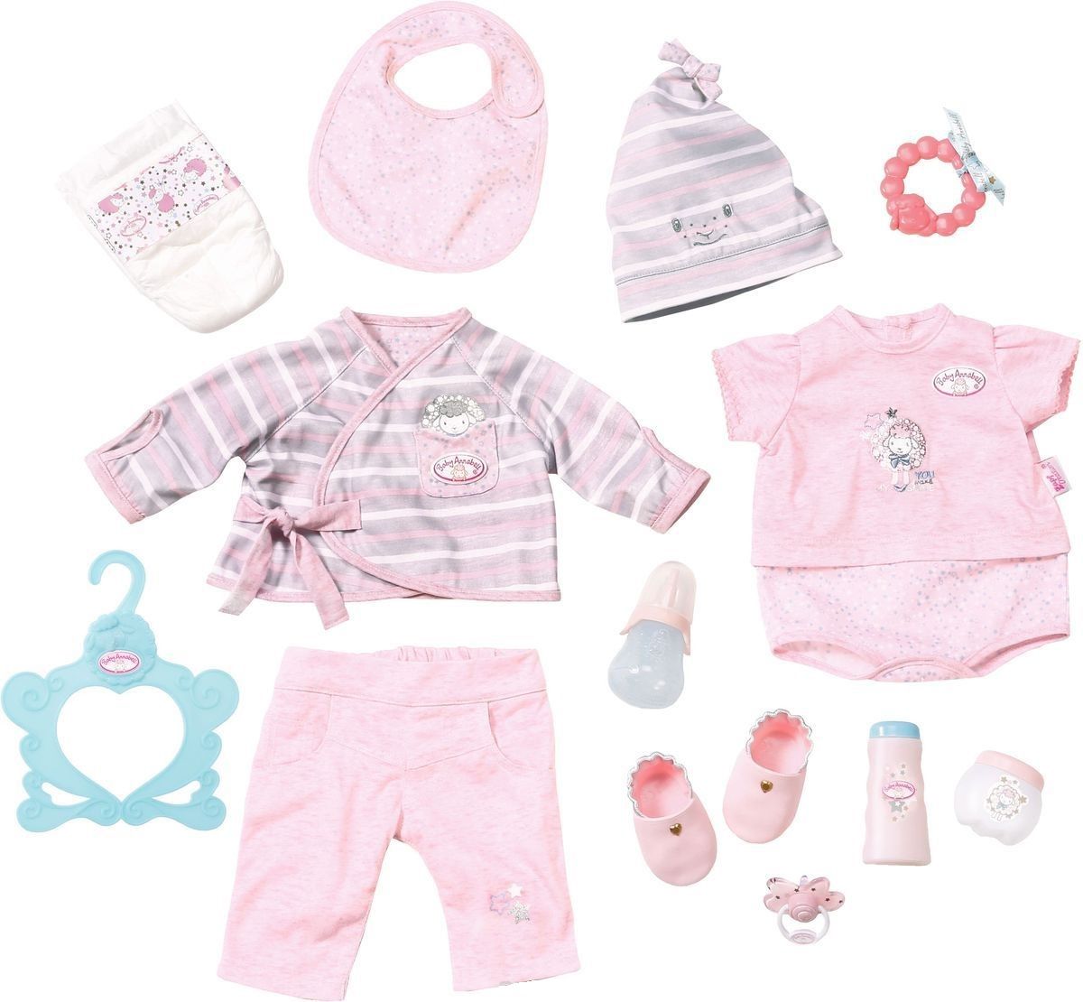 | В комплекте | подгузник, соска, бутылочка, 2 тюбика крема, прорезыватель для зубов, штанишки, распашонка с длинными рукавами, боди, шапка, вешалка для одежды и туфельки |