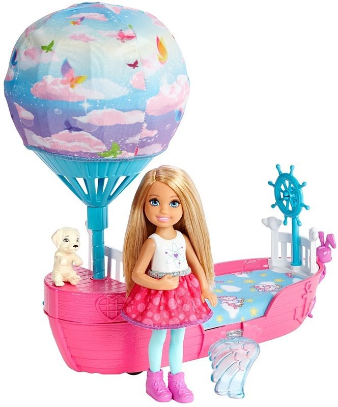 Кроватка одновременно станет для Челси крылатой лодочкой и большим воздушным шаром. Игрушка Barbie от Mattel выполнена в розово-голубых тонах и украшена сказочными рисунками. Дополнительно в наборе есть одеяло и подушка.