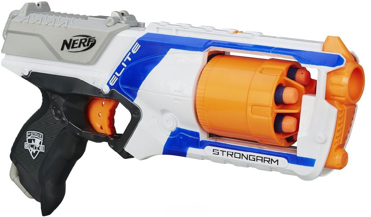 Бластер Nerf "Элит Стронгарм" от Hasbro – это отличный вариант оружия для любителей игр в войну, суперагентов, полицейских. Большим достоинством этого бластера является способность стрелять в двух режимах – ручном и полуавтоматическом, что дает возможность не отвлекаться во время стрельбы на перезаряд до момента опустения достаточно вместительного барабана. В комплекте с оружием идут 6 универсальных многоразовых стрел, которые подходят для всех бластеров из серии Elite N-Strike. В игре заряды для бластера "Элит Стронгарм" абсолютно безопасны, так как выполнены из мягких и нетоксичных материалов – паралона и вспененной резины. Если случайно ваш юный стрелок потеряет стрелу, допустим, в траве или кустах, то ее легко будет найти благодаря яркому оранжевому цвету. Еще одним немаловажным достоинством бластера "Стронгарм" является его мощность, позволяющая стрелять на довольно большие расстояния – до 27 метров.