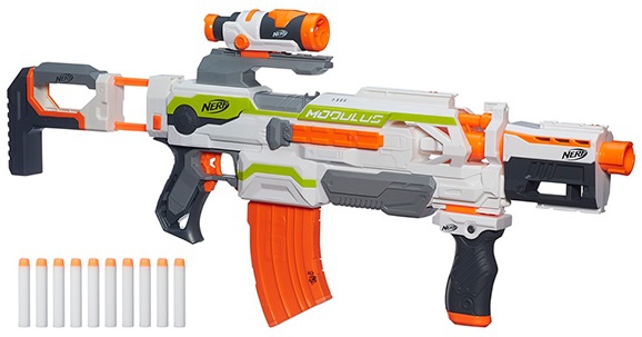 Уникальность бластера Nerf "Модулус" от Hasbro заключается в том, что его можно моделировать, снимая базовые элементы и заменяя их другими из дополнительных наборов. База "Модулус" состоит из бластера с прихватом спереди и магазином на 10 патронов, которые входят в набор, приклада, снайперского прицела, невероятно крутой и удобной рукояти и насадки на дуло.
