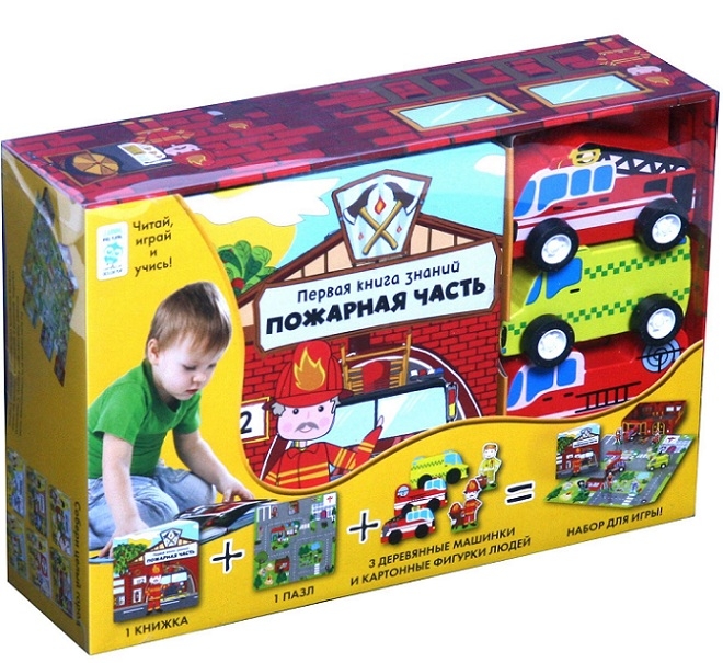 Первая книга знаний "Пожарная часть"Махаон46923019КнигиТип: игровой набор, книгаВозраст: 5 - 11 летПол ребенка: для мальчиковМатериал: дерево, картон, бумагаВ комплекте: 3 деревянные машинки,6 картонных фигурок, пазл из 16 элементов, книга Тренируемые навыки: чтение, внимание, развитие речи, творческие способности