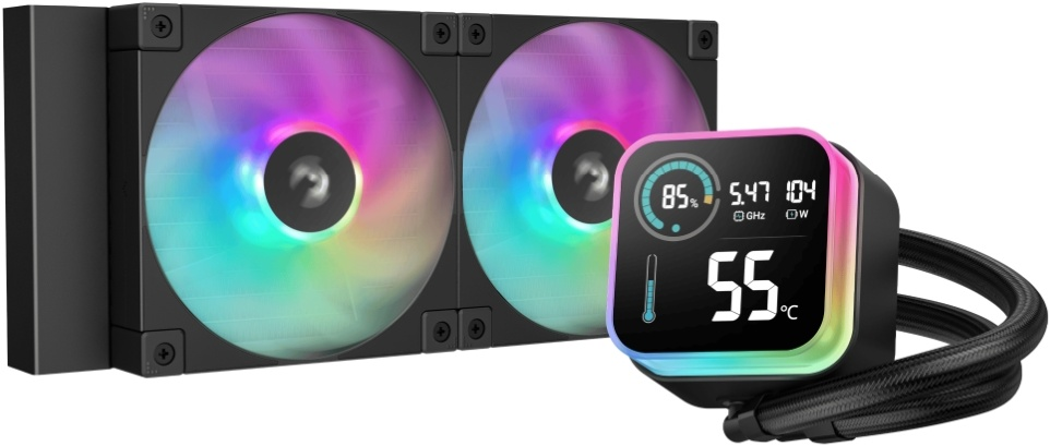 Водяное охлаждение (СВО)Socket: AM4, AM5, LGA115х, LGA1200, LGA1700, LGA 1851Материал радиатора: алюминийКоличество вентиляторов: 2Размеры вентилятора: 120х120х25 ммМаксимальная рассеиваемая мощность: 280 ВтУровень шума: 32.8dBAВодяное охлаждение: даТип коннектора: 4-pin PWM + 3-pin 5V ARGB Подсветка: вентиляторов и помпыЦвет подсветки: ARGBВес: 1530 г
